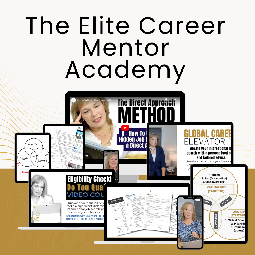 The Elite Career Mentor Academy is a Done-With-You, guided program, helping skilled professionals secure their international roles. Here you get: